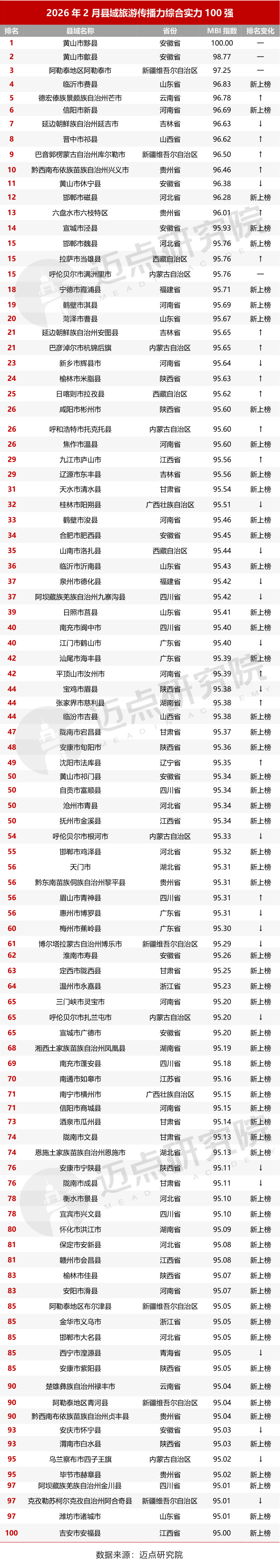 近日,在迈点研究院最新发布的《2026年2月县域旅游传播力综合实力100强》榜单中,黄山市四县全部上榜,黟县、歙县斩获榜单第一、第二名,休宁县位列第11名,祁门县位列第50名、为新上榜。