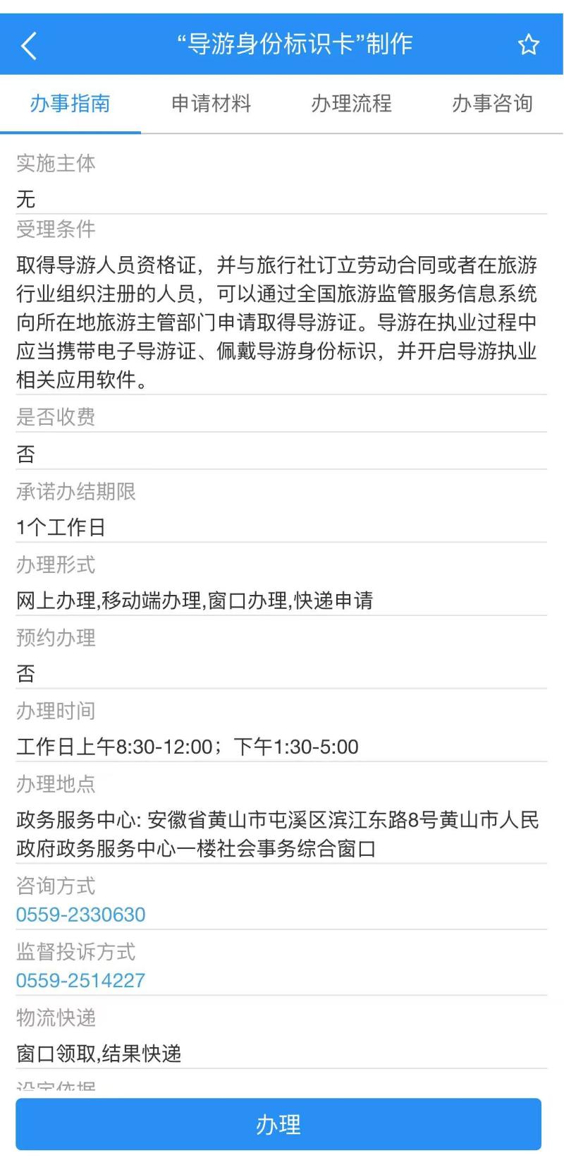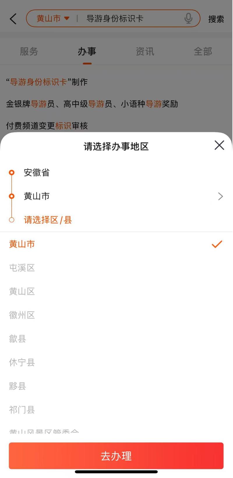 一、登录皖事通APP或安徽政务服务网,在搜索框输入“导游身份标识卡”制作,点击事项名称为“导游身份标识卡”制作的事项进入办理,办事地区请选择“黄山市”再点击“去办理”。