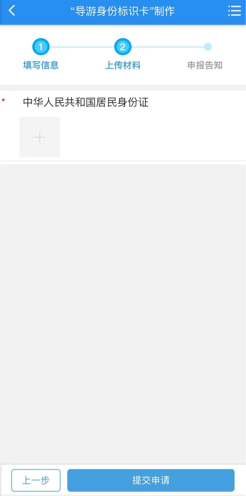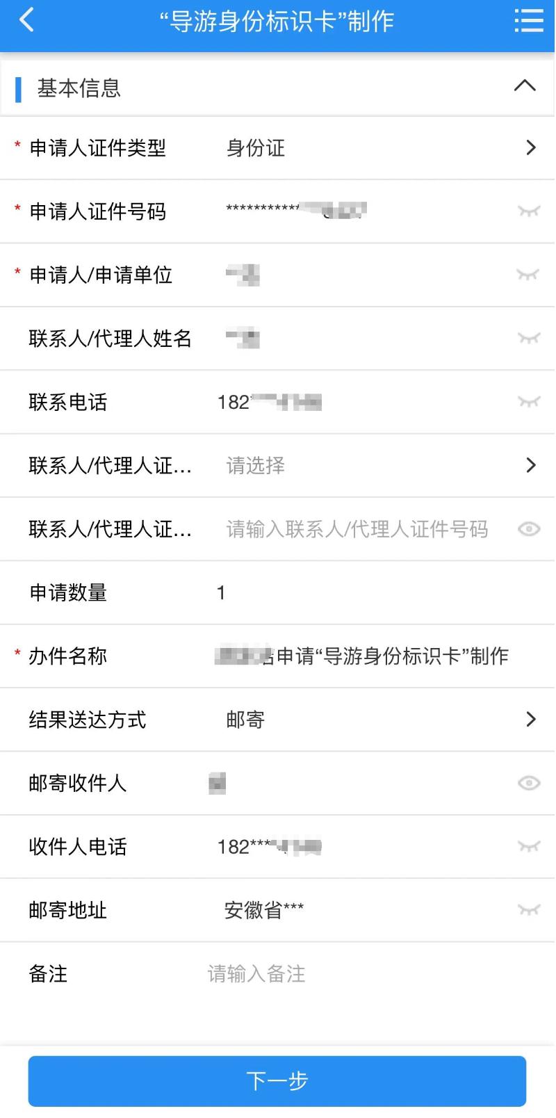 二、在“导游身份标识卡”制作事项中,填写邮寄收件人、收件人电话、邮寄地址等基本信息,结果送达方式选择“邮寄”,点击下一步,在“中华人民共和国居民身份证”栏目提交旅行社注册导游名单(盖章)、申请人身份证照片,点击“提交申请”,等待市文化和旅游局驻政务中心窗口办理。