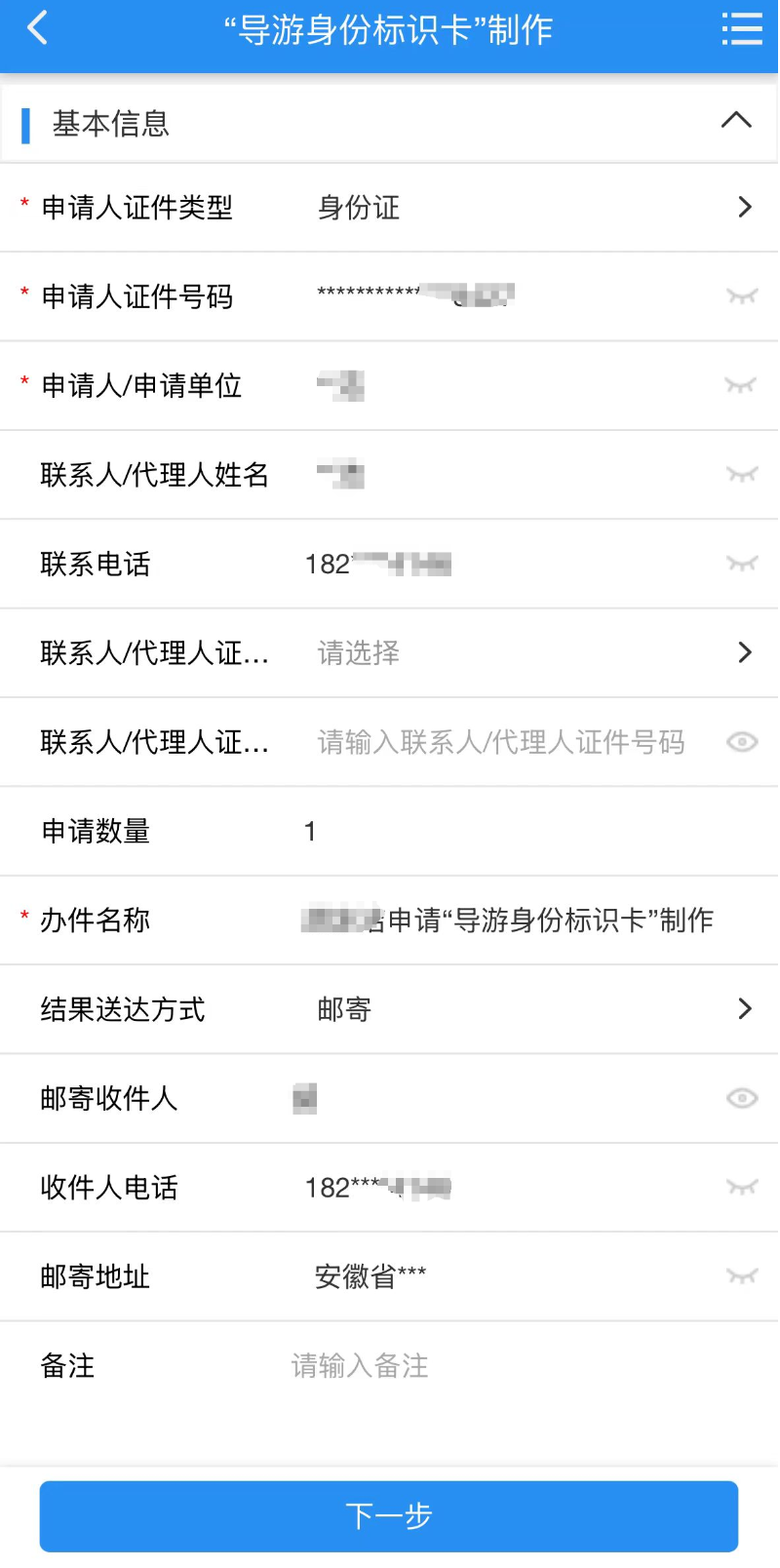 二、在“导游身份标识卡”制作事项中,结果送达方式选择“邮寄”,填写邮寄收件人、收件人电话、邮寄地址等基本信息,点击下一步,在“中华人民共和国居民身份证”栏目提交旅行社注册导游名单(盖章)、申请人身份证照片,点击“提交申请”,等待市文化和旅游局驻政务中心窗口办理。