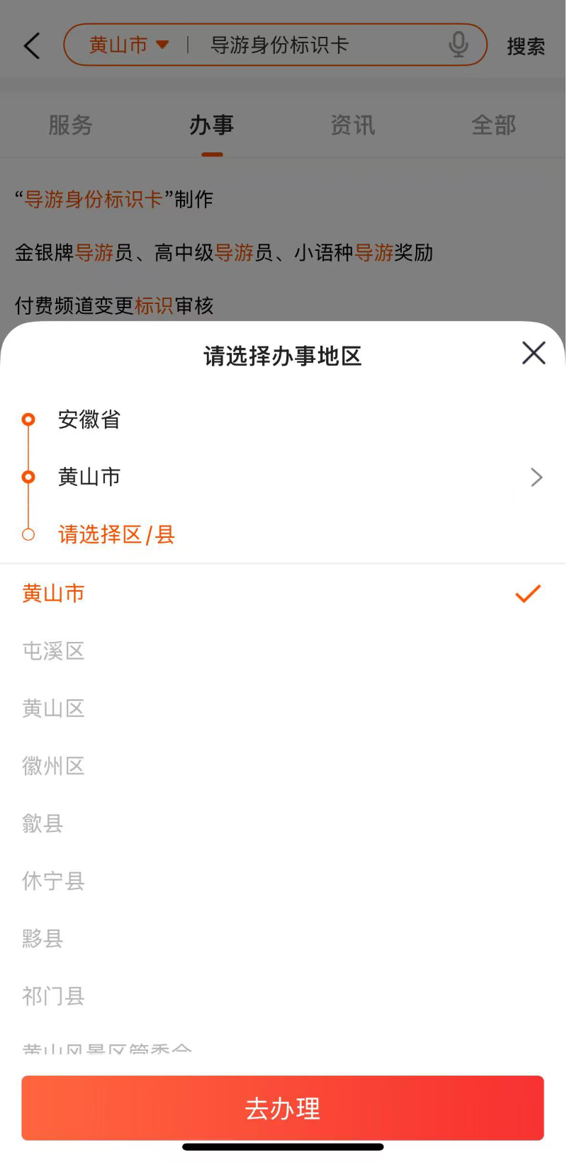 一、登录皖事通APP或安徽政务服务网,在搜索框输入“导游身份标识卡”制作,点击事项名称为“导游身份标识卡”制作的办事事项进入办理,办事地区请选择“黄山市”再点击“去办理”。