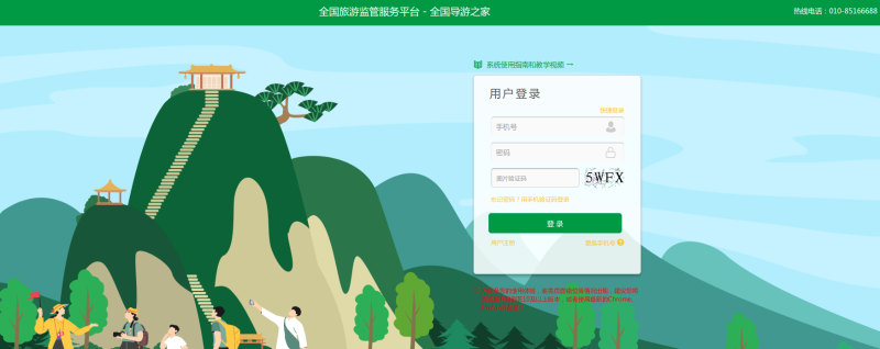 一、通过电脑或者手机浏览器登陆全国导游之家网页端https://tourguide.mr.mct.gov.cn/unauthorized/login,账号密码同全国导游之家APP,或者使用手机号和验证码登陆。